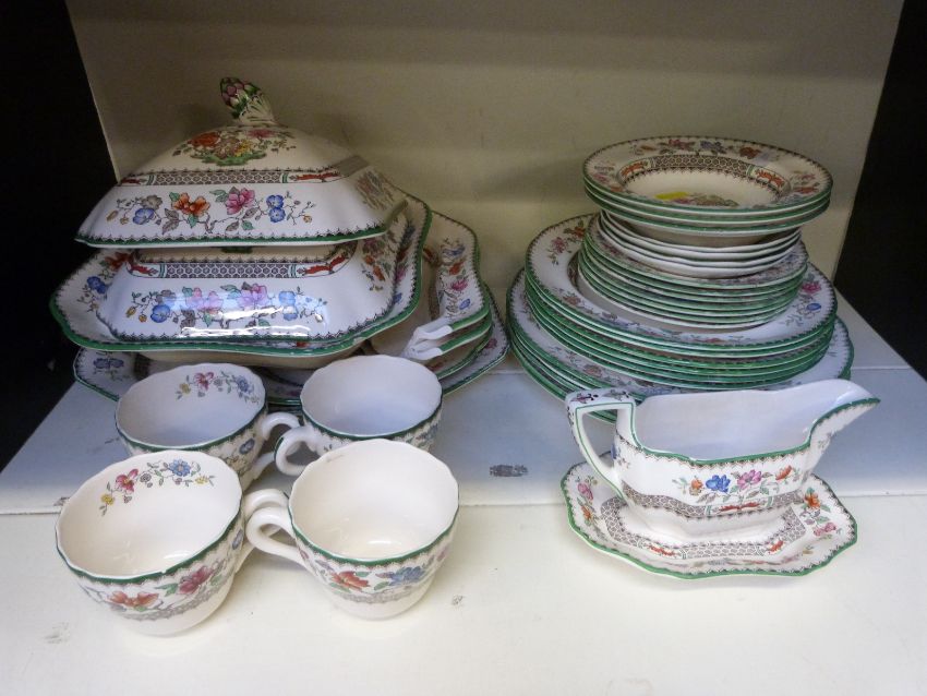 Copeland Spode part dinner service; Chinese Rose pattern, to include two tureens, four cups and saucers, three cereal bowls, seven side plates, six medium plates, five dinner plates, saucer boat and stand, and two graduated serving dishes.