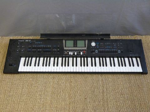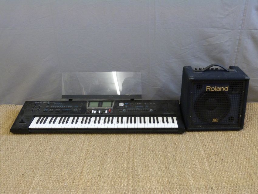 A Roland BK-9 backing keyboard, six octaves, with fitted music lectern together with a Roland KC-60 3 channel mixing keyboard amplifier.