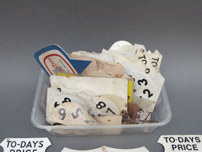 A collection of vintage c1960's butcher's shop price labels, wooden key fob etc includes local interest Hilliers of Nailsworth etc
