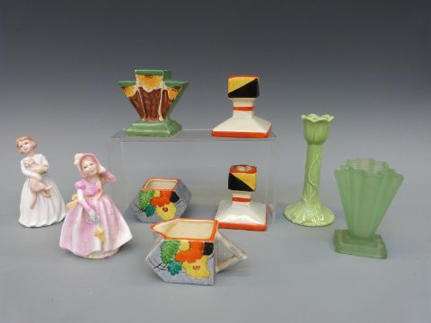 A collection of ceramics including Art Deco Bursley Ware candlesticks, Myott stepped vase, Beauchin Ware jug & sugar bowl, Royal Doulton figures Babie HN2121 & My First Pet HN3122, uranium glass vase & Swedish candlestick.