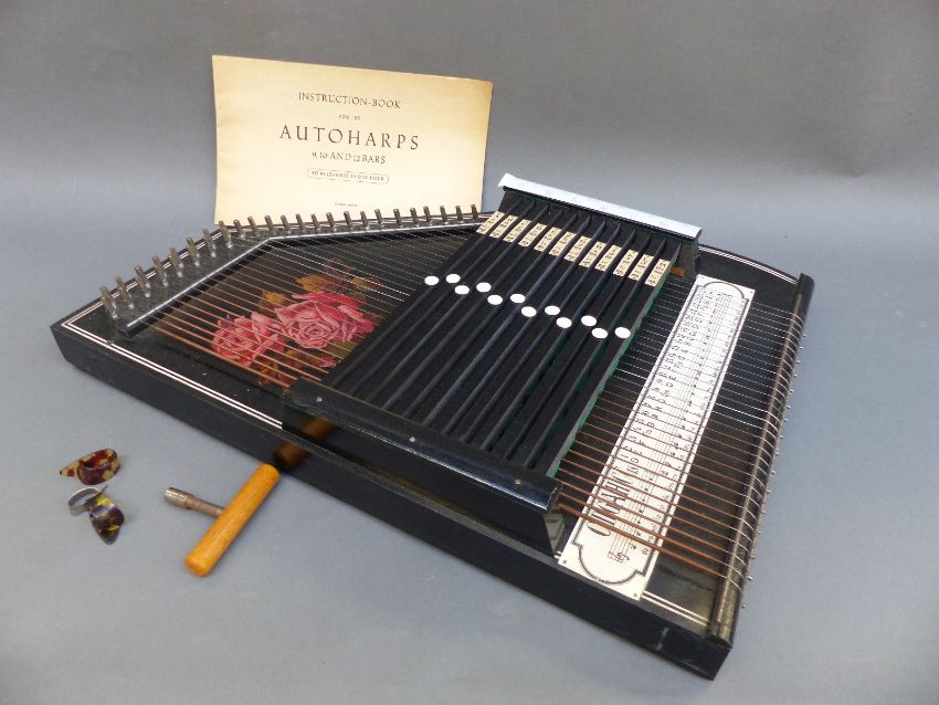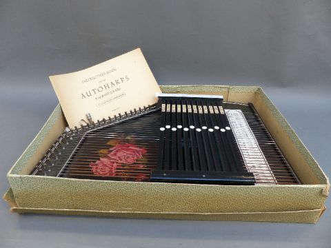 A German autoharp with 12 chords in lacquered finish in original box with instruction book, tuning key, plectrum etc