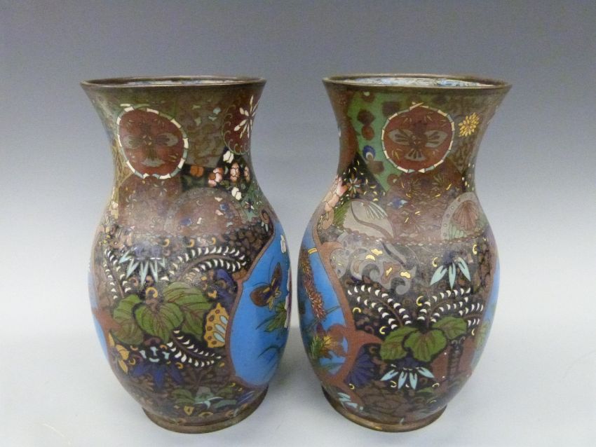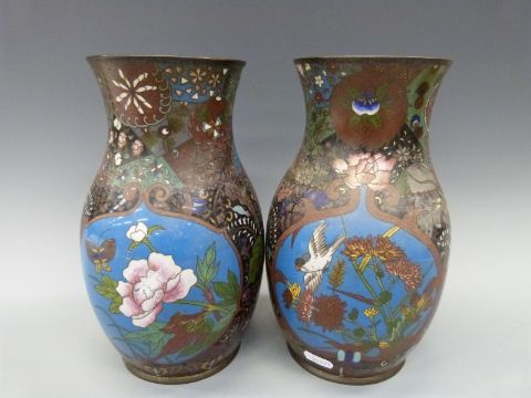 A pair of late 19th/20thC Japanese cloisonne vases with decoration of birds, flowers and butterflies 25cm tall