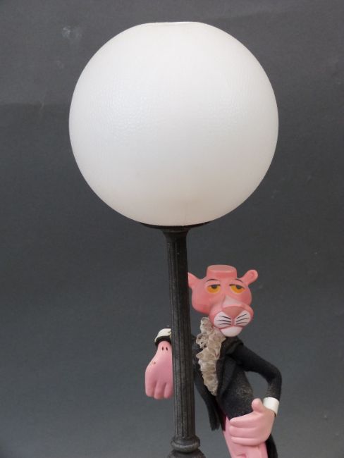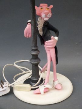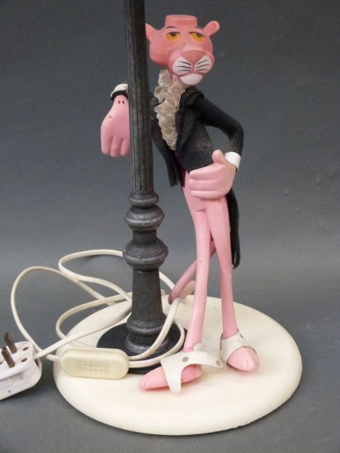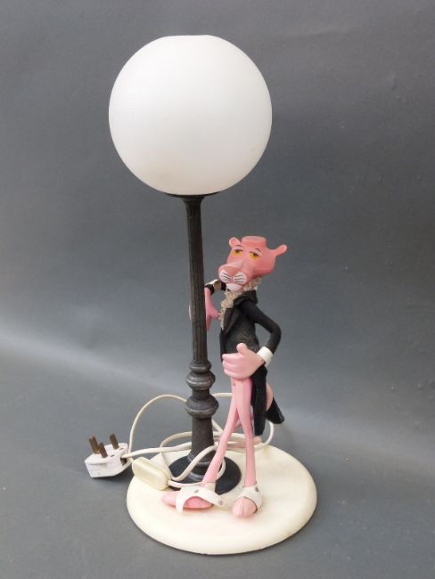 A vintage table lamp in the form of a suited Pink Panther leaning against a lamp post, height 50cm