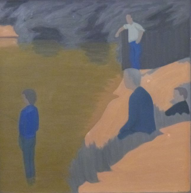 Bryan Senior (1935 -) framed modernist oil on canvas of figures fishing entitled 'Anglers' signed and dated 67 lower right and labelled verso, approx. 60cm x 60cm