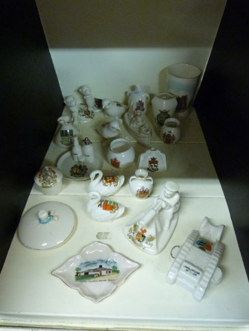 A collection of crested china to include WWI tank by Willow, machine gun turret by Arcadian, ship, and other novelties including examples by Goss approximately 21 in total