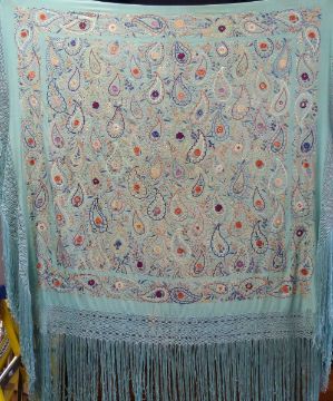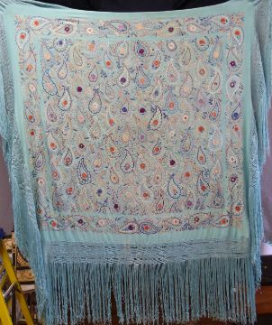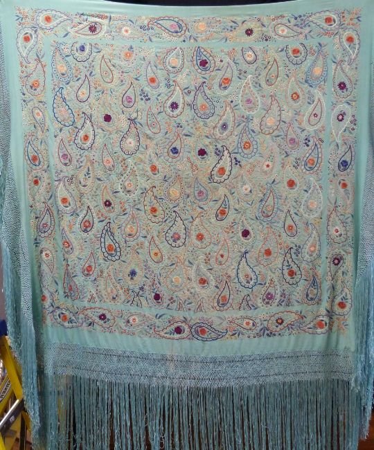 A Chinese Art Deco silk fringed piano shawl with embroidered floral decoration on a green background, approximately 120cm square not inc. tassels.