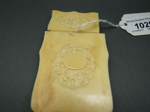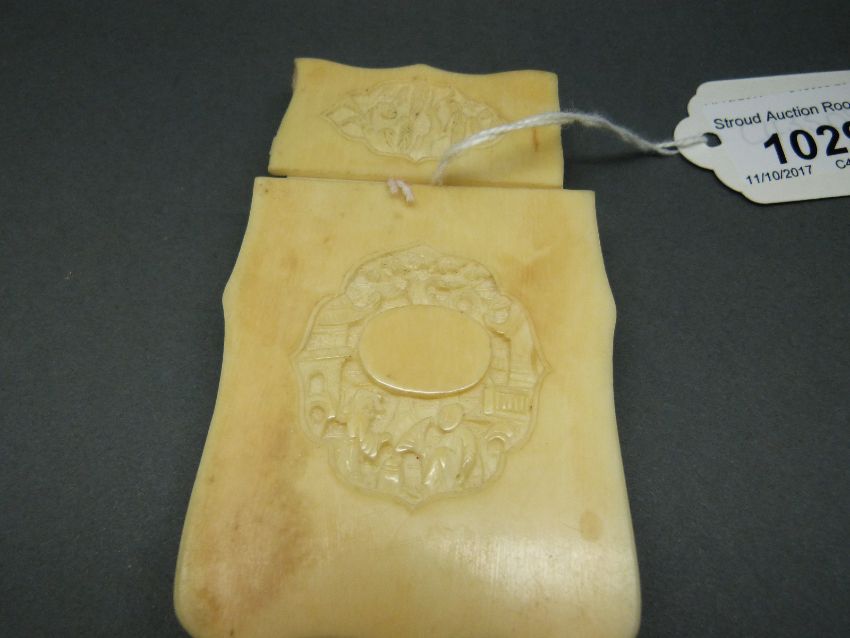 A 19thC deeply carved Chinese card case depicting dragons verso two carved cartouche depicting figures and buildings, length 9.5cm