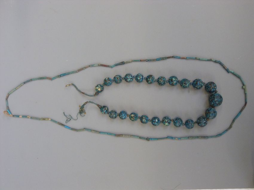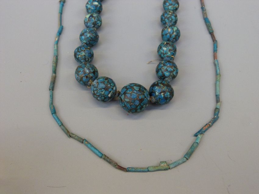 An ancient Egyptian faience beaded necklace and another similar, length 72cm