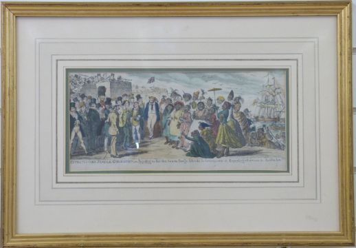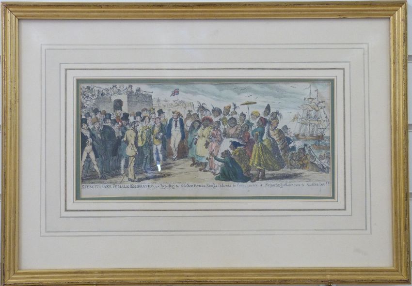 George Cruikshank 19thC politically incorrect colour print 'Effects of Over Female Emigration or Importing the Fair Sex from the Savage Islands in Consequence of Exporting all our own to Australia!!!, 16 x 36cm