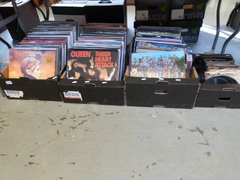 Approximately 300 LPs in various conditions including Queen (11), Bowie (6), The Beatles including Sgt Pepper picture disc (5), Elton John, Nilsson and Kraftwerk together with a box of singles