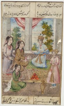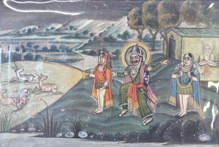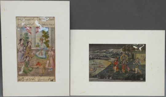 Two Indian watercolours with gilt highlighting, one of ladies dining the other a hunting party, each approximately 10 x 15cm