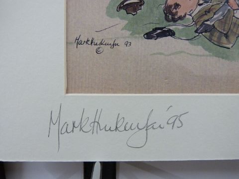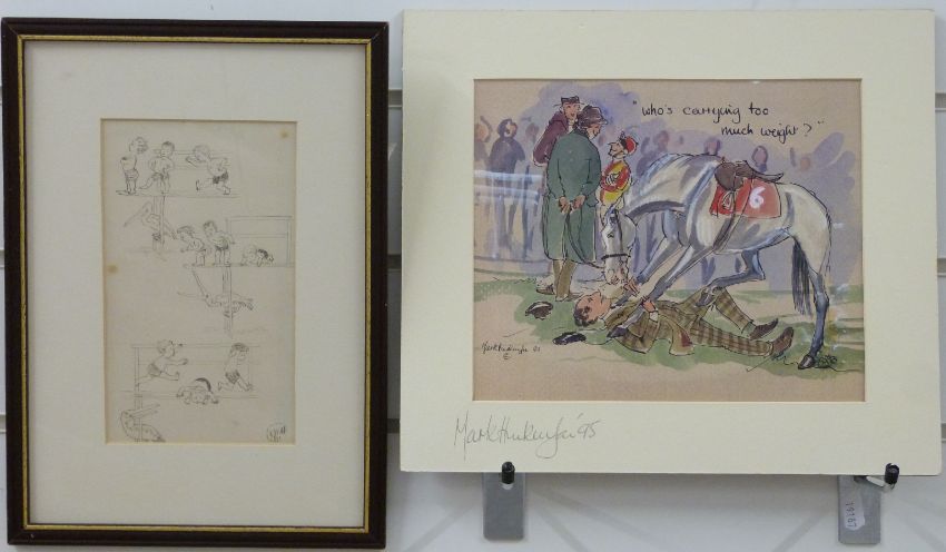 Victorian pen and ink sketch of young boys at play and a bird (29.5 x 11.5cm) together with Mark Huskinson horse racing signed print "Who's Carrying Too Much Weight"