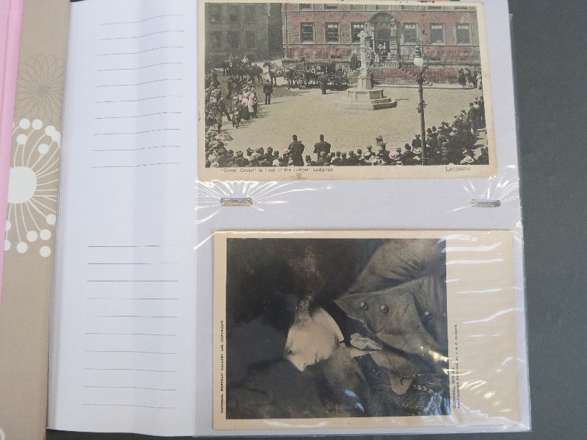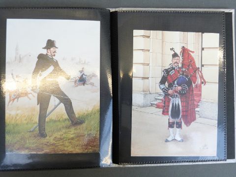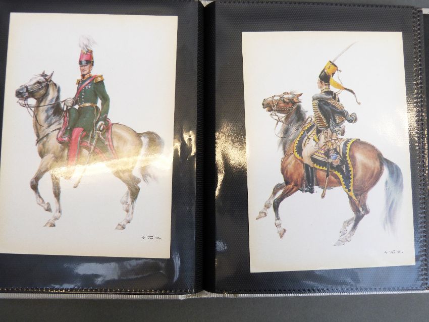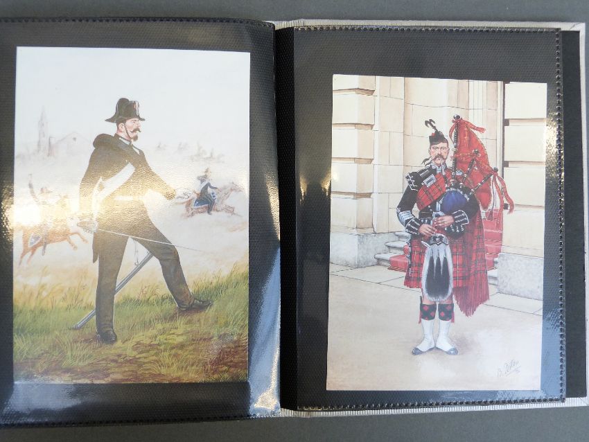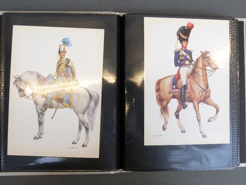 An album of mainly military related postcards, Napoleonic, WWI, individual and group photos, memorials etc, together with an album of uniform cards
