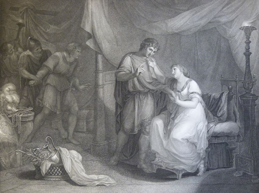 Four late 18thC/early 19thC Boydell Shakespeare engravings, two Hamlet, two Troilus and Cressida each approx 54 x 74cm overall.