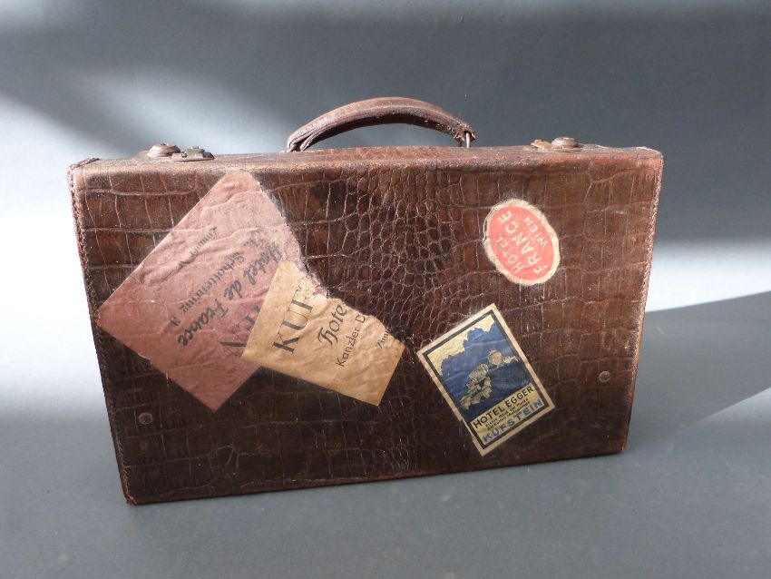 A tan leather mock crocodile suitcase with vintage travel labels, approximately 40cm long.