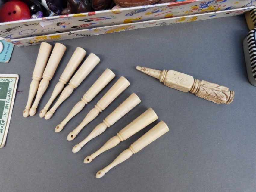 A quantity of sewing ephemera to include 19thC ivory lace bobbins, buttons, mending kits, thread etc.