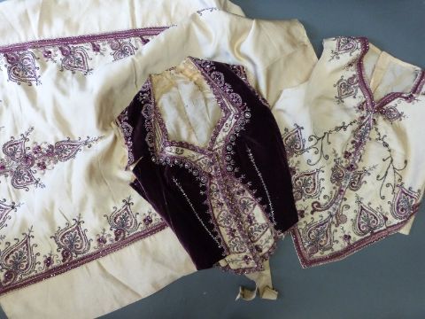 Edwardian ladies jacket finished in mauve and purple with bead and sequin decoration to the front and back of the garment and a silk lining, the label marked Muhin Blossier Paris together with another garment of similar design altered in the 1930's and two under garments, one with weighted trim