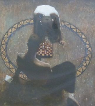 Iain Faulkner (Scottish, b.1973) 'Draughts Players III' initialed IF lower left, 75 x 69cm