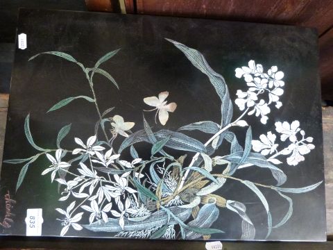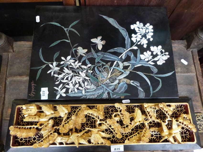 A Japanese painted and inlaid panel decorated with mother of pearl butterflies together with a carved and gilt wooden wall panel