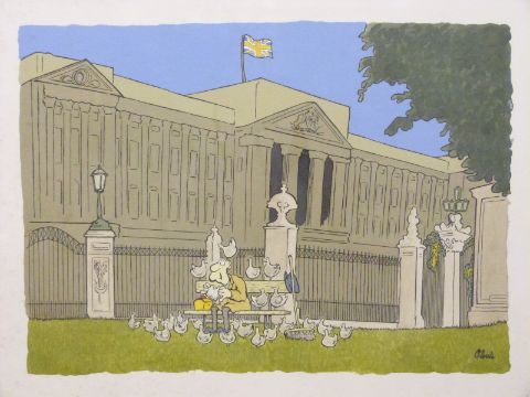 G Small cartoon of a man eating outside Buckingham Palace being hassled by birds, 53 x 72cm