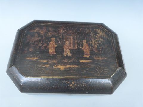 A Japanese lacquer jewellery box with fitted interior containing various bone items, the gilt decorated exterior with scenes of figures in the garden, raised on carved feet (27cm x 20cm x 13cm)
