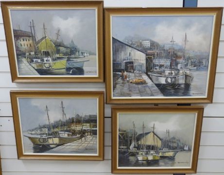 Four modern oil paintings of Bristol harbour and docks by J Dallas, each 39 x 49cm