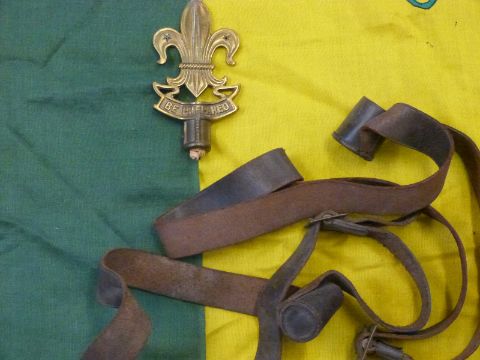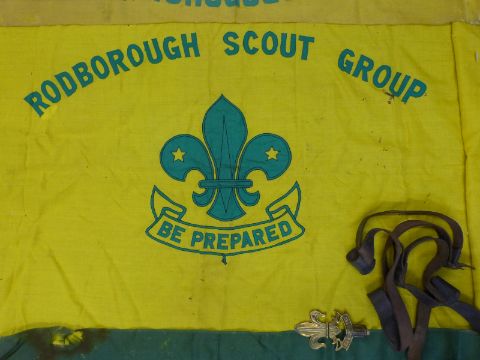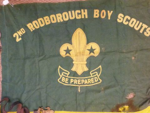 A collection of Rodborough Scout group flags, staffs etc
