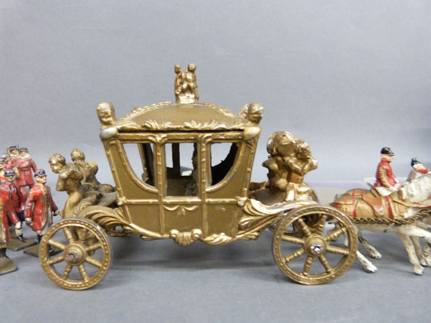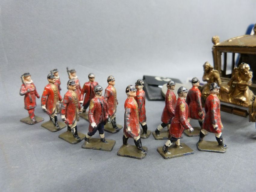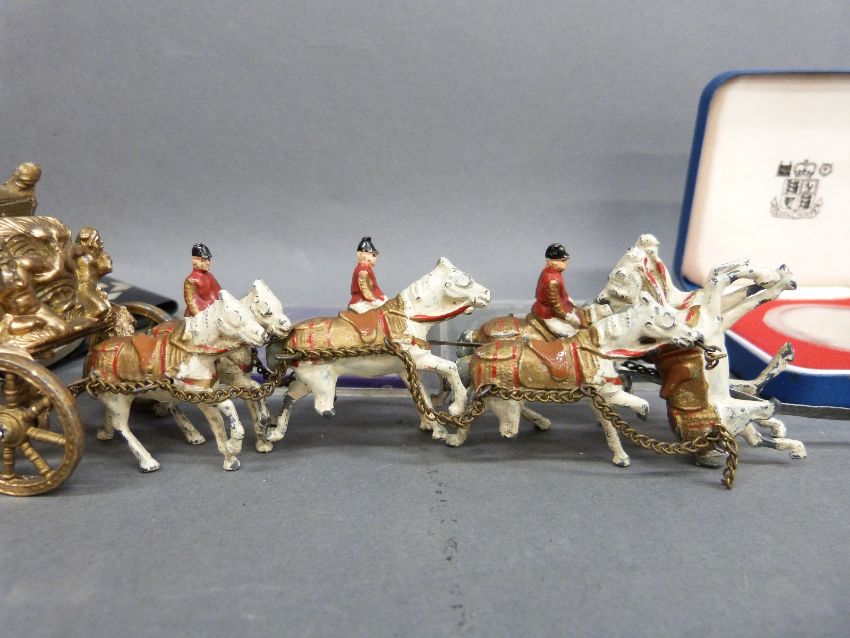 A collection of badges, coins, silver collared, diecast carriage etc