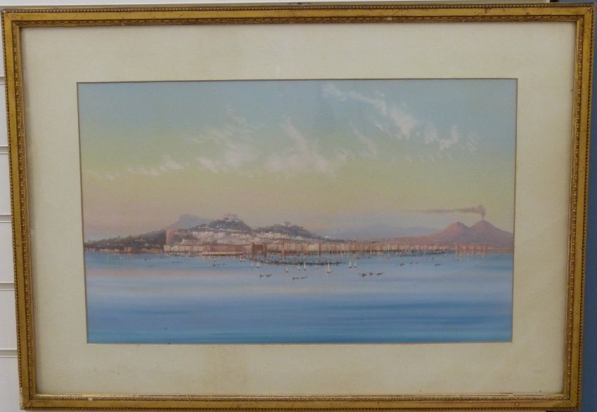 A 19thC Italian gouache of Mount Vesuvius and the Bay of Naples, 37 x 61cm