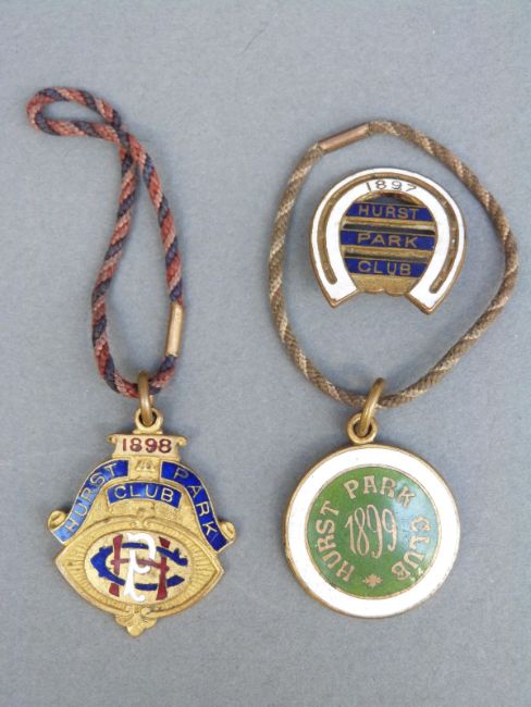 Five Victorian enamel Hurst Park Racecourse badges,1890, 1897, 1898 and 1899