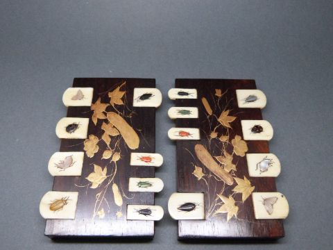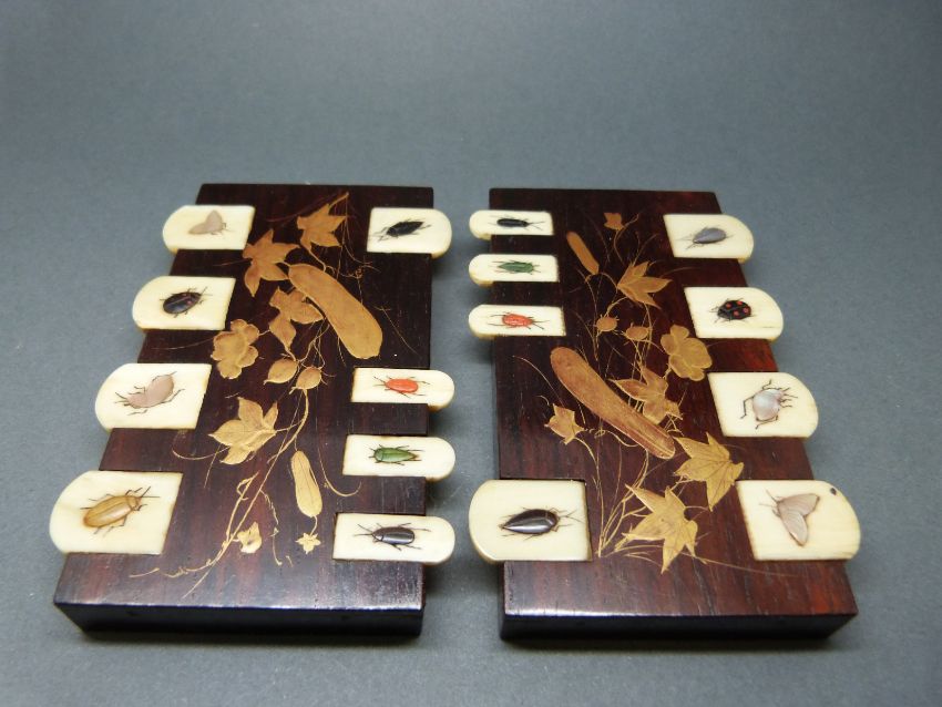 A pair of 19thC Shibayama bridge counters with a foliate lacquer design and ivory, jet, pearl and coral insects.
