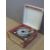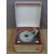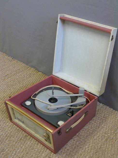 Dansette c1960s portable electric record player with four speed deck in pink and grey Rexine type finish