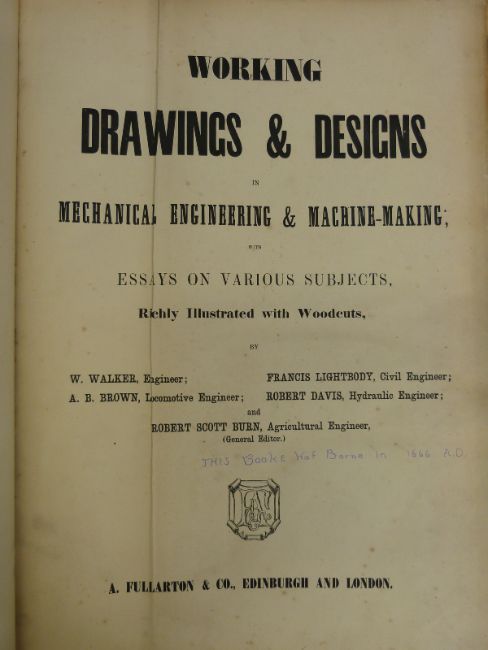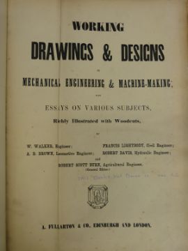 Working Drawings & Designs in Mechanical Engineering & Machine-Making with Essays on Various Subjects, Richly Illustrated with Woodcuts. A. Fullarton & Co. many text engravings, Foldout plates (Steam Cranes, Pumping Engine, Hydraulic Press, Locomotive) additional plates at rear. Half leather with gilt bands on spine. Folio.