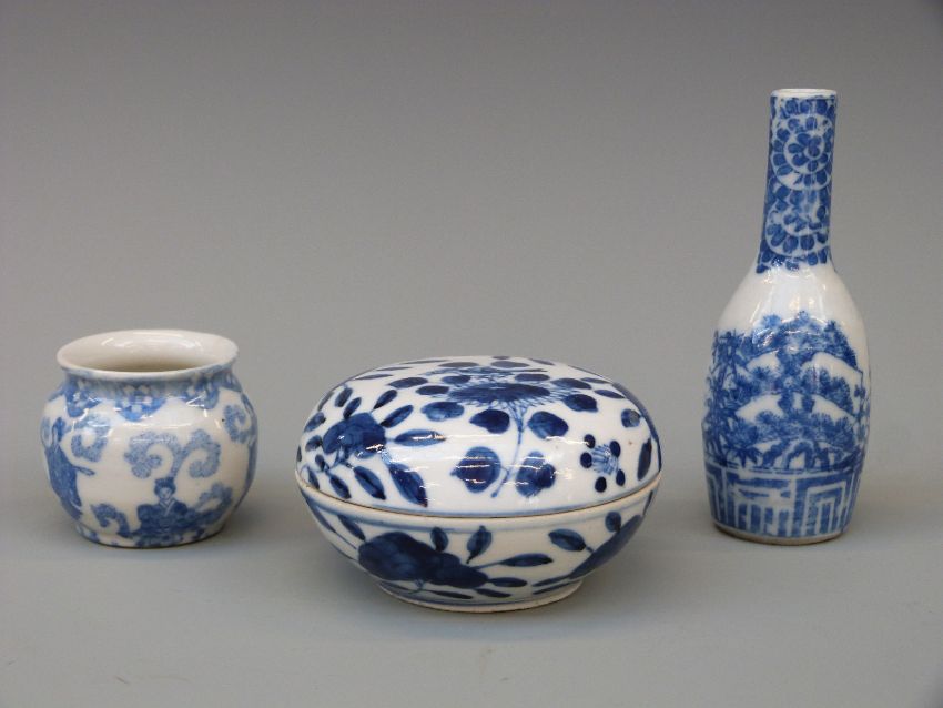 A Chinese lidded pot with four character mark to base and two other items, tallest 10cm