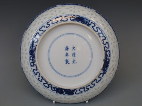 A Chinese pedestal dish with central dragon decoration, rice grain border and six character marks to base, 25cm diameter