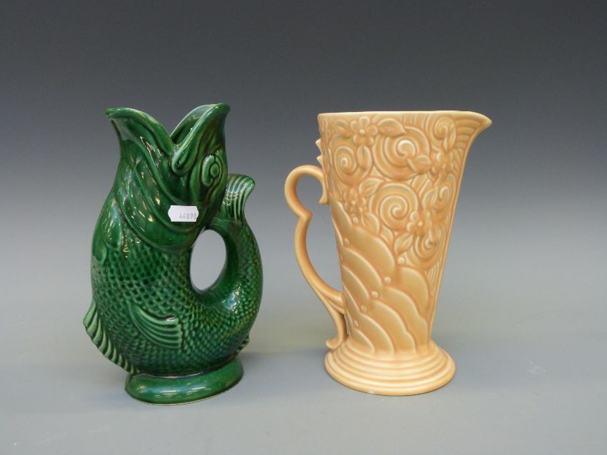 Two jugs to include an Art Deco example by Wade relief moulded with flowers, shape 371 and Dartmouth glug fish jug, largest approximately 23cm tall