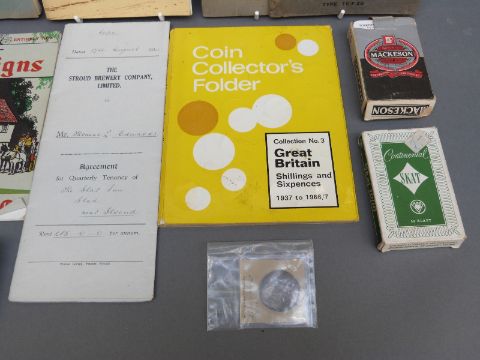 A quantity of ephemera to include playing cards, local interest items, Stroud Brewery 1934 agreement, Brimscombe port halfpenny, Marling School booklets, silver sixpences etc