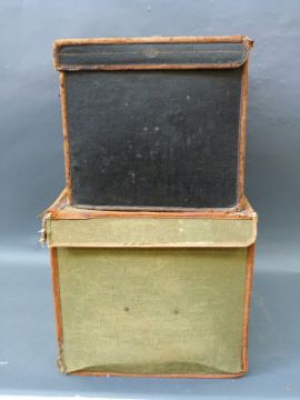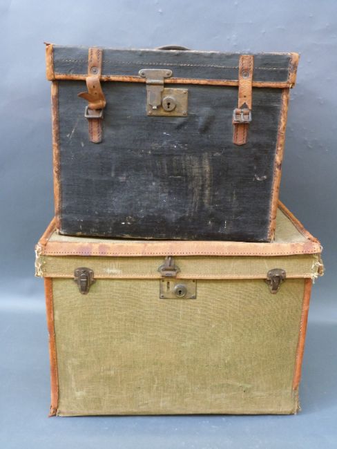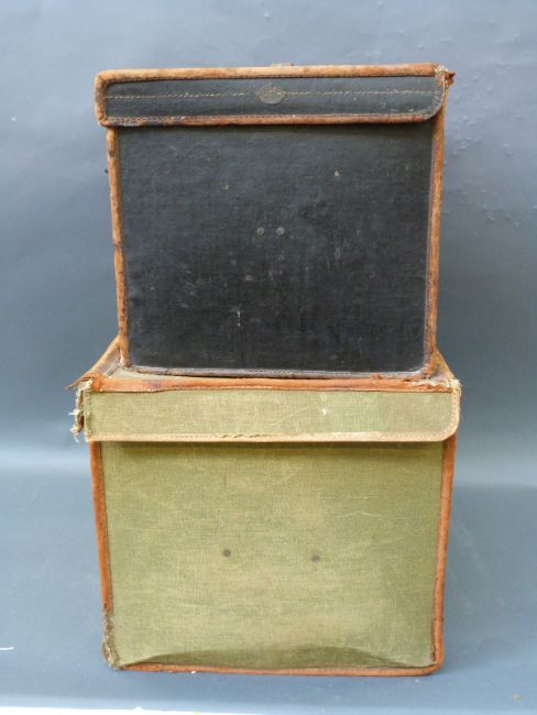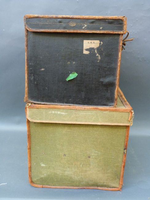 Two rectangular leather trimmed canvas vintage hat boxes, one with makers mark for Army and Navy with GWR labels etc, leather straps and lock approximately 55cm long