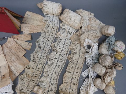 A quantity of handmade cotton lace, lace making items, vintage steel scissors etc.