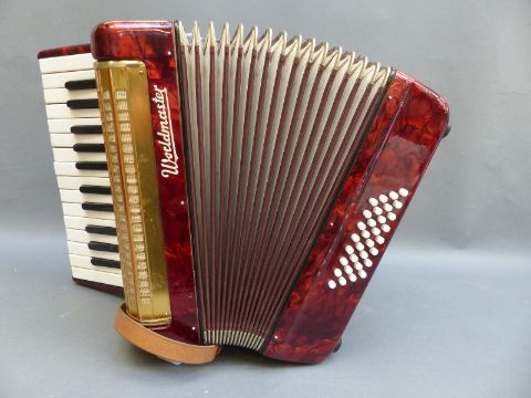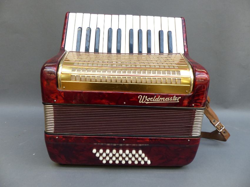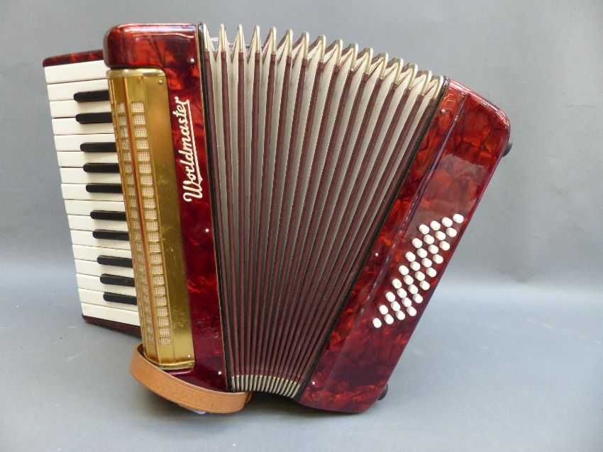 Worldmaster 32 bass (4 x 8 configuration) piano accordion in red pearloid finish, with original case.