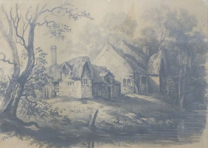 A 19th/early 20thC pencil drawing of a water mill and cottage, 35 x 49cm