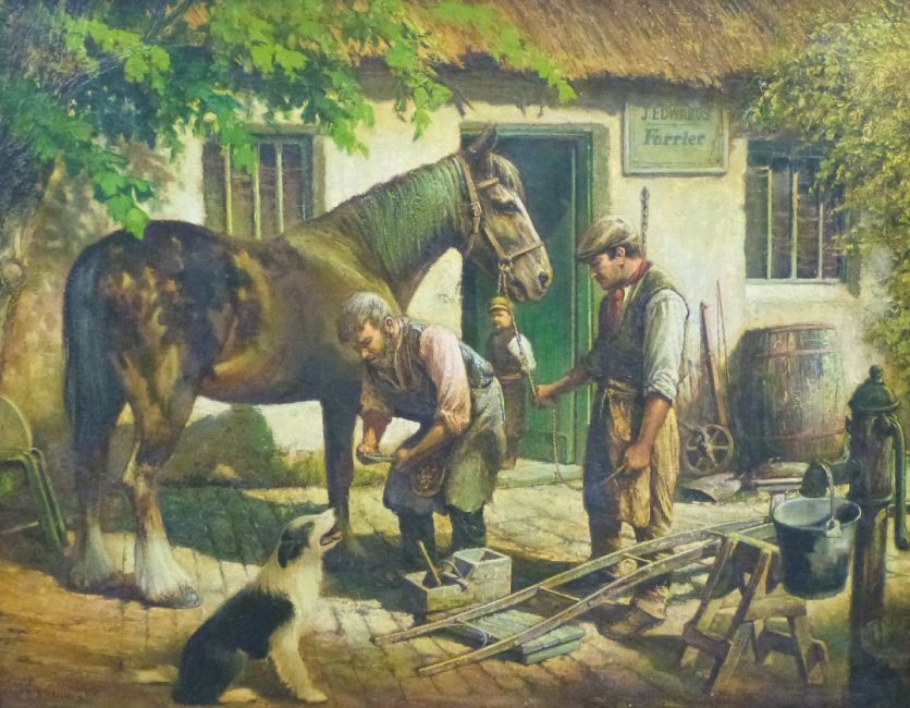 Joseph Henry Lynch (1911-1989) oil on canvas of J Edwards, farrier shoeing a horse signed lower left, in gilt frame, 67 x 88cm