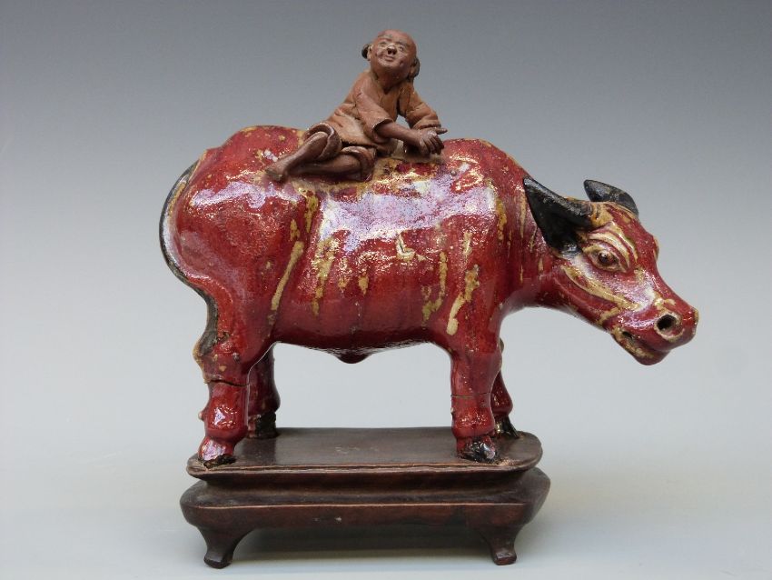 A Sumida Gawa figure of a figure riding a buffalo, 16.5cm tall
