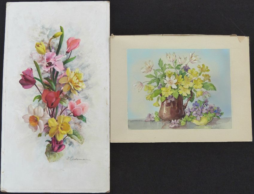 Two watercolours of flora, one oil on board signed F.Osborne, 36 x 20cm, the other unsigned