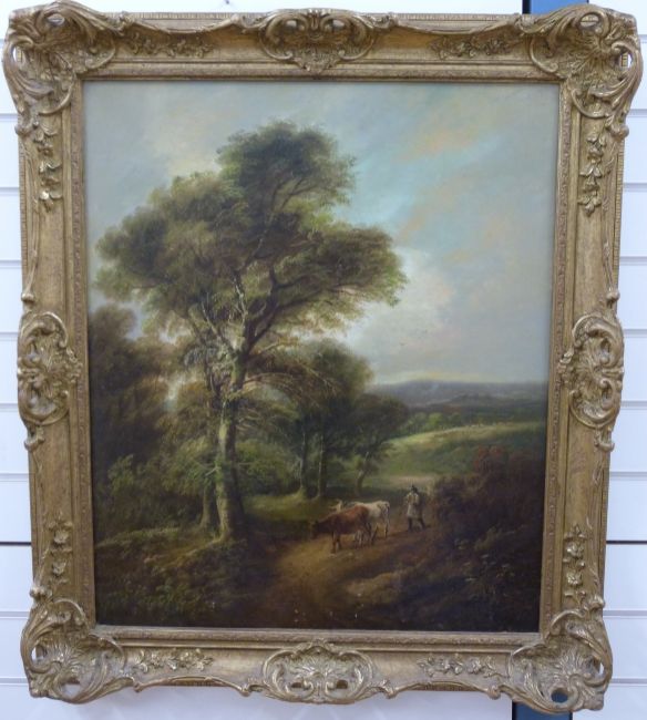 J Barker pair of 19thC oil on canvas, one cattle by a waterfall with further cattle on path to foreground, the other cattle being driven down a path with landscape beyond, both signed lower left, 74 x 62cm in ornate gilt frames