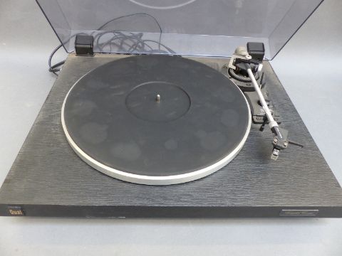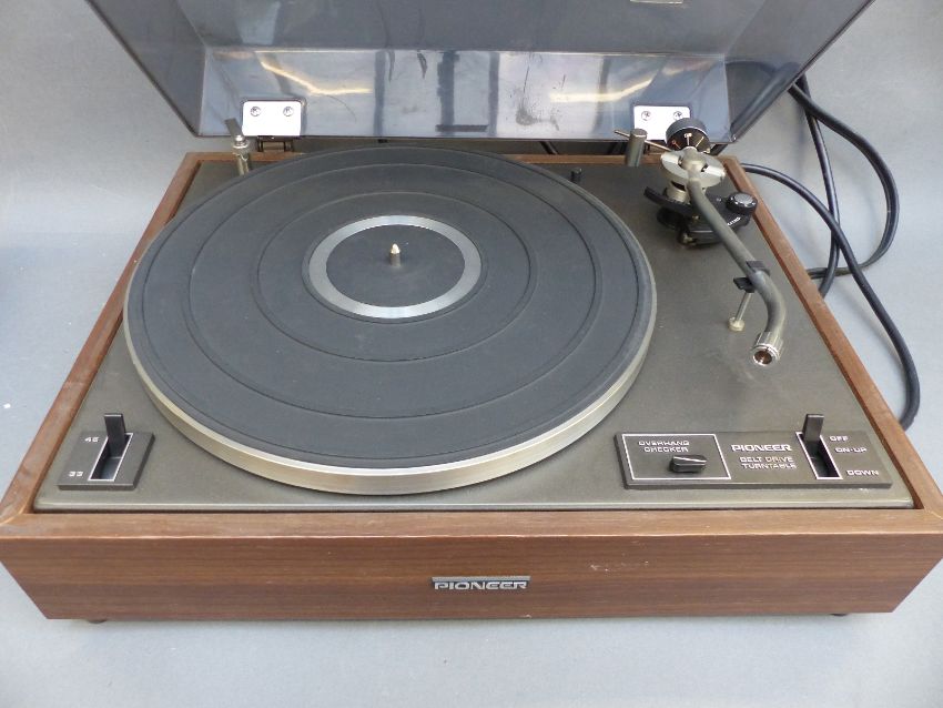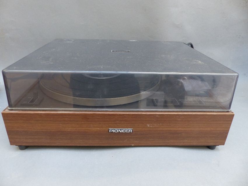 Dual Audiophile Concept CS503-1 two speed record player, together with a Pioneer example with belt drive two speed turntable, both in wood finish with smoked perspex lids.