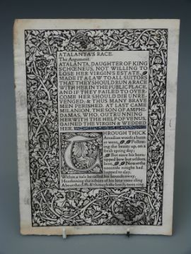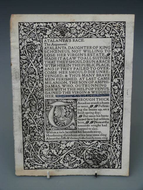 Kelmscott Press working proof sheet for Atlanta's Race by William Morris from The Earthy Paradise (1896), single page with an intricate border surround and initial letter, original decoration drawn in ink and white by William Morris beneath the lines of introduction, 23 x 16cm