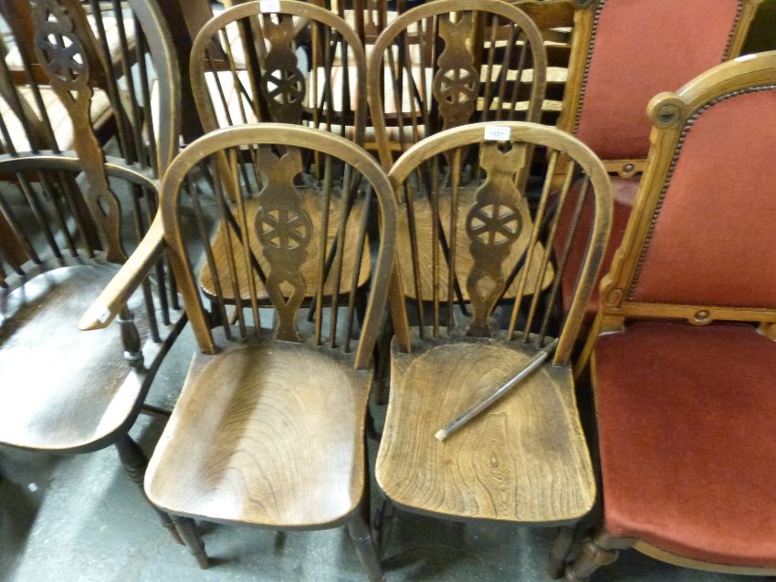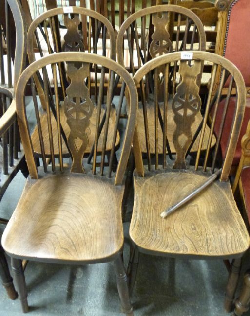 A set of four 19thC elm seated dining chairs (see lot 1552 for matching Windsor chair)
