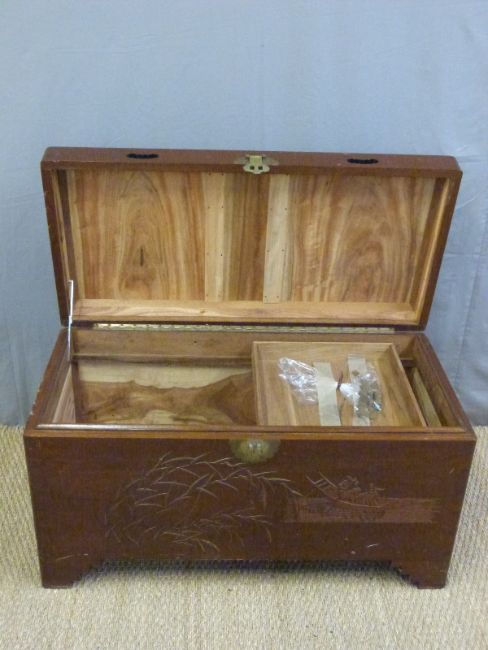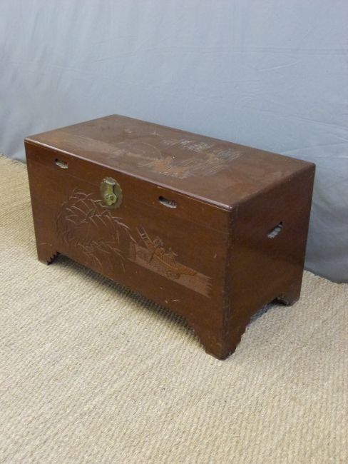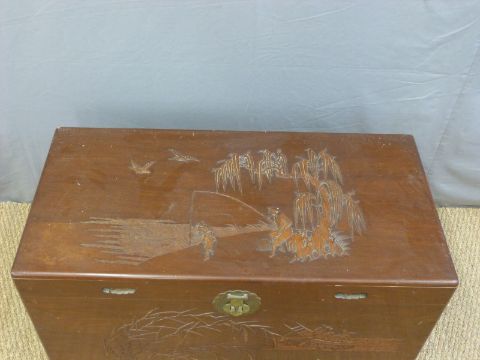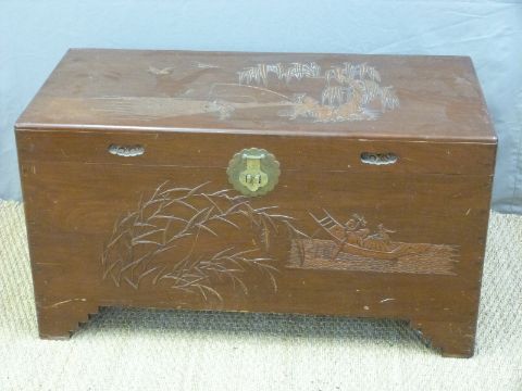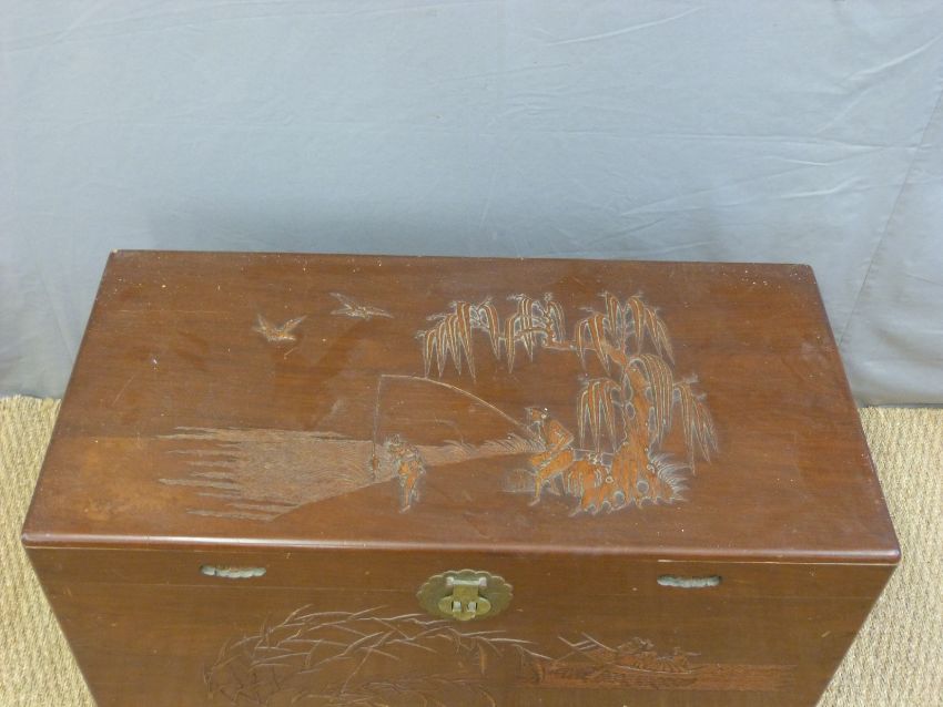 A carved oriental chest with camphor lining and decoration of a fishing scene (H56 x L103 x D50)
