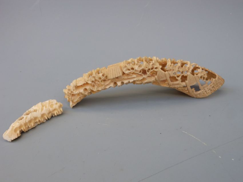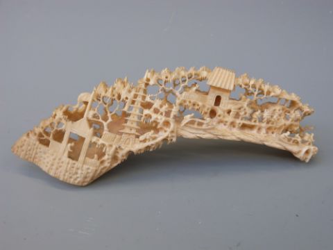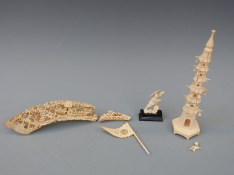 A collection of carved ivory items to incolude model of a man, flag, temple and tusk depicting figures and buildings